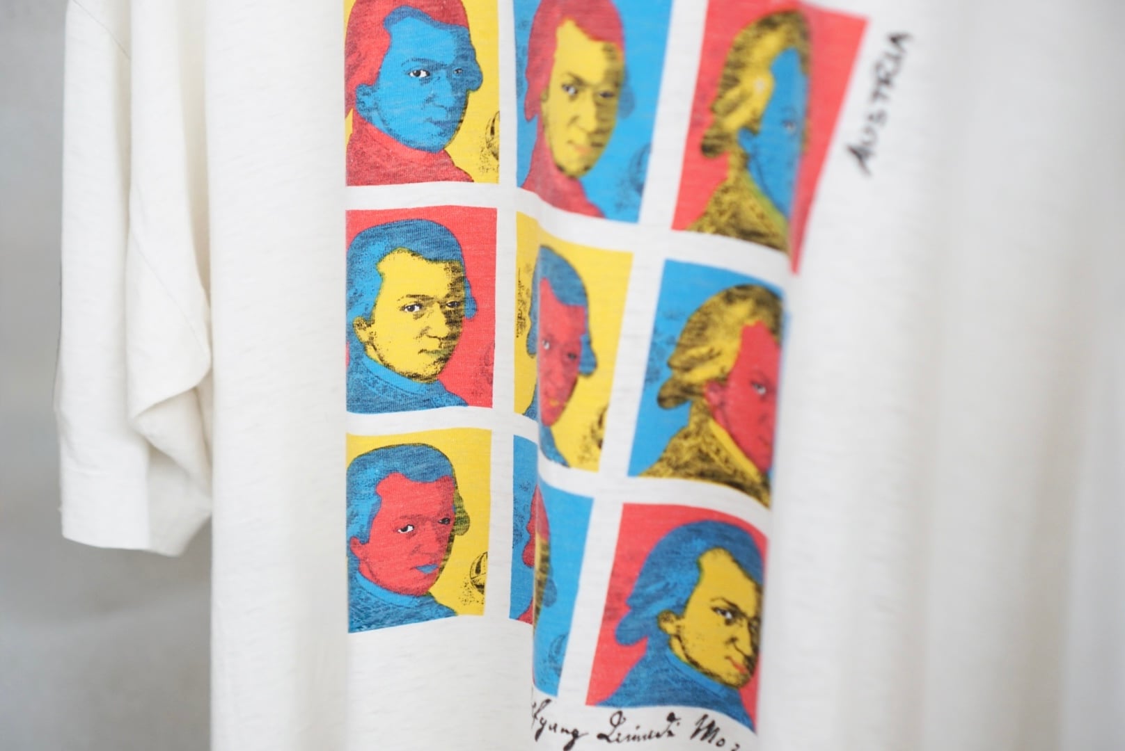 オーストリアを代表する作曲家モーツァルトをモチーフにしたTシャツ。 クラシック×ポップカルチャーというユニークさとデザインの効いた1着となっております。 肩幅 58 袖丈 20.5 身幅 55.5 着丈 66