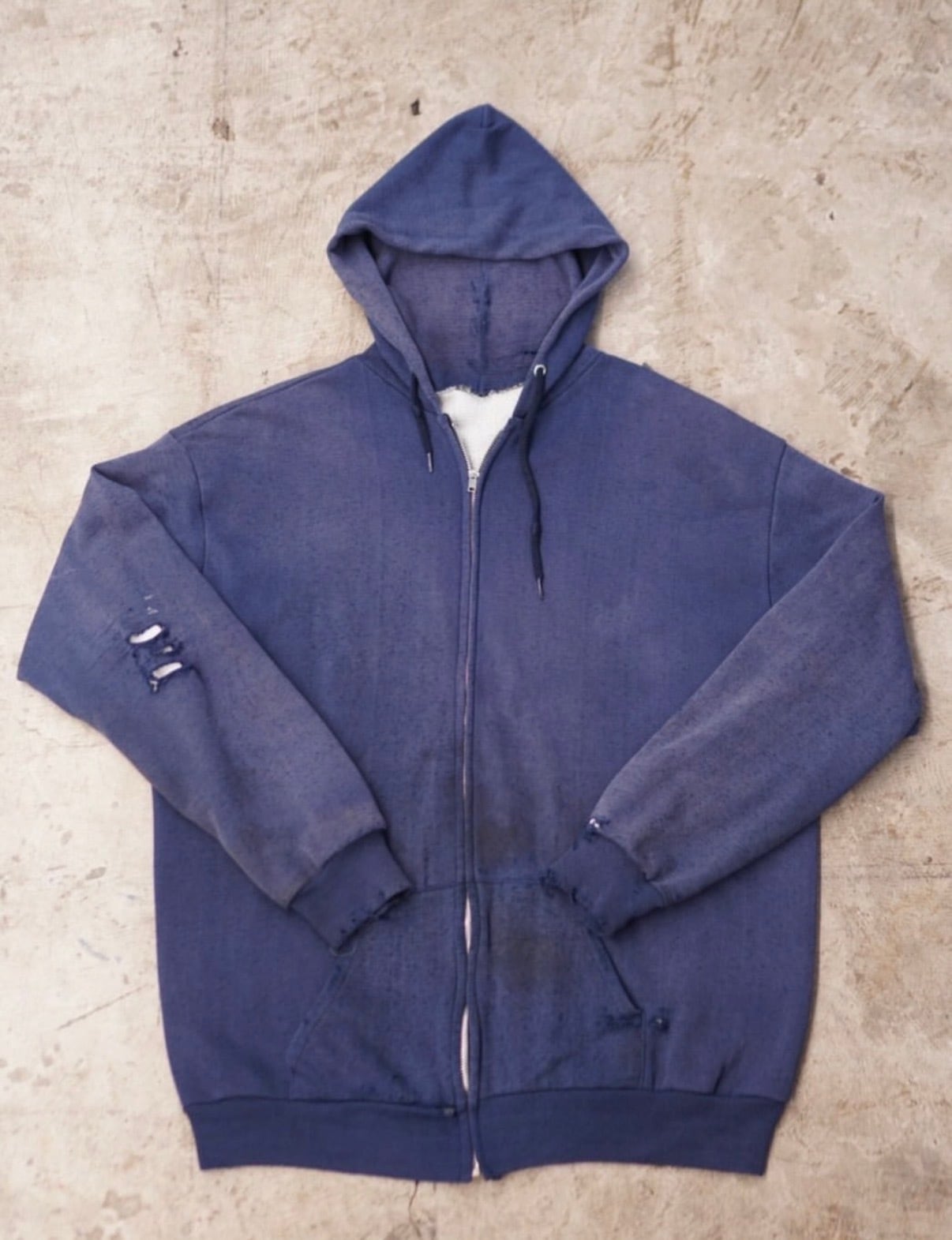 深みのあるネイビーボディに、長年の着用によって生まれたフエードとダメージが唯一無二の存在感を放つジップアップフーディ。