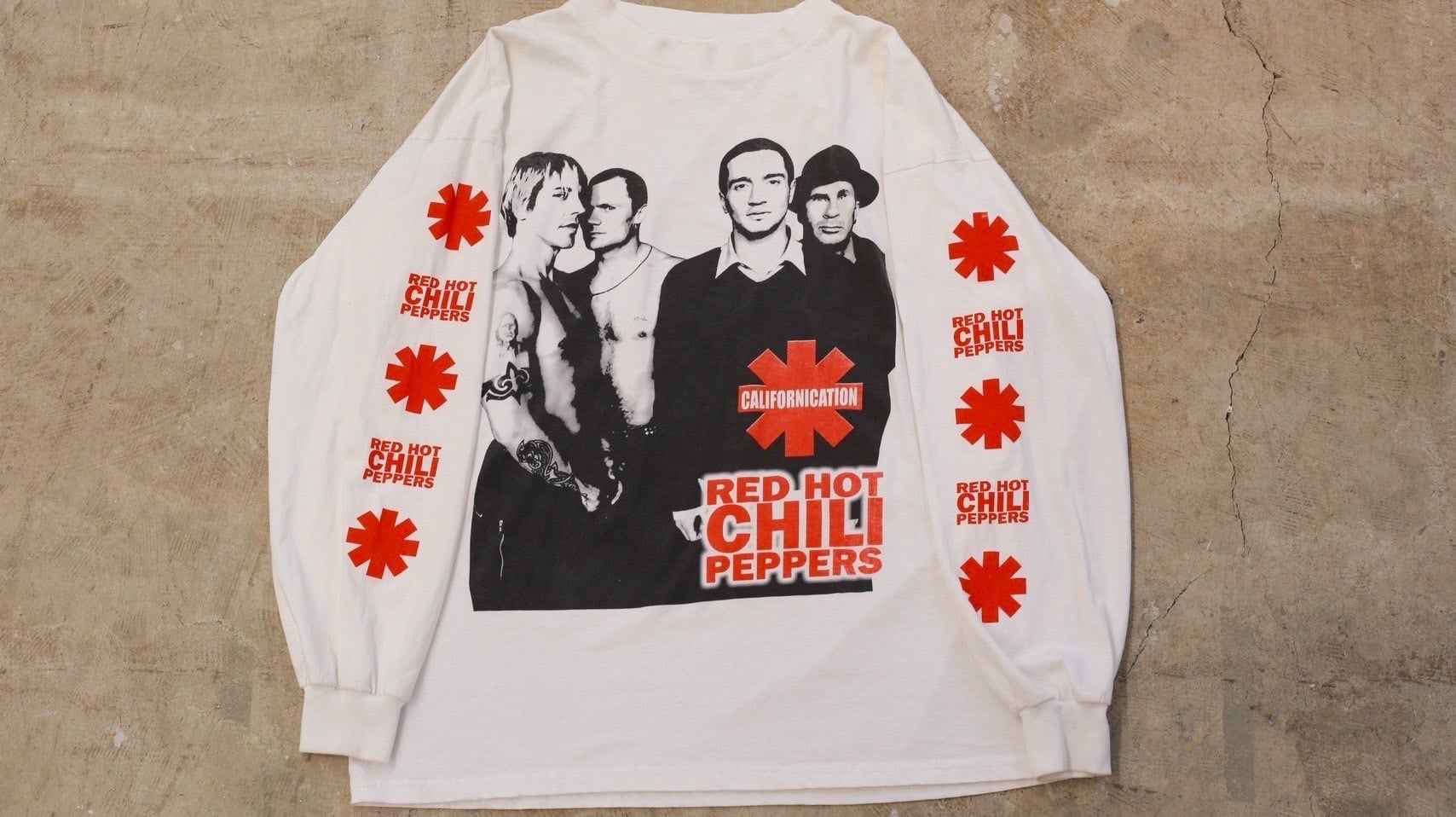 アメリカ合衆国カリフォルニア州出身の世界最強のロックバンド、レッド・ホット・チリ・ペッパーズがプリントされた90年代のヴィンテージT-shirt。