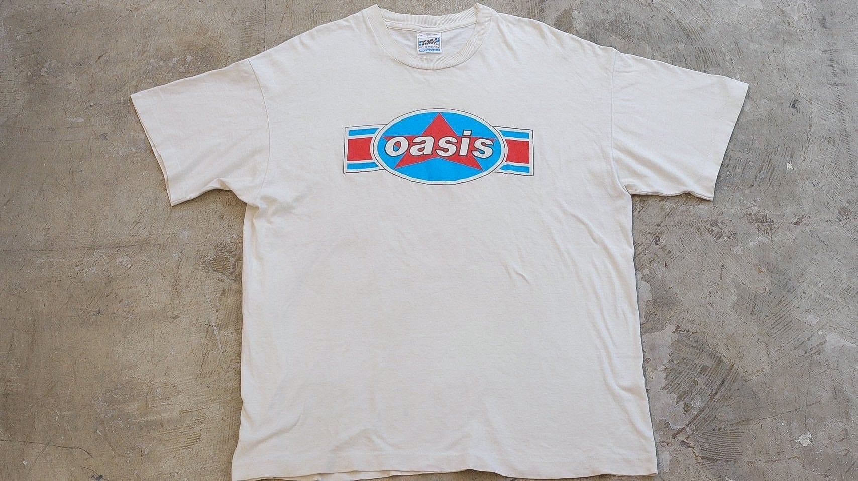 ギャラガー兄弟が率いたモンスターブリットポップバンドOASISのロゴがプリントされたホワイトT-shirt。