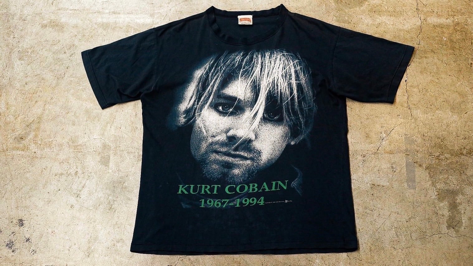 伝説的なロックバンドNirvanaのフロントマンであるカート・コバーンを追悼するメモリアルT-シャツ。