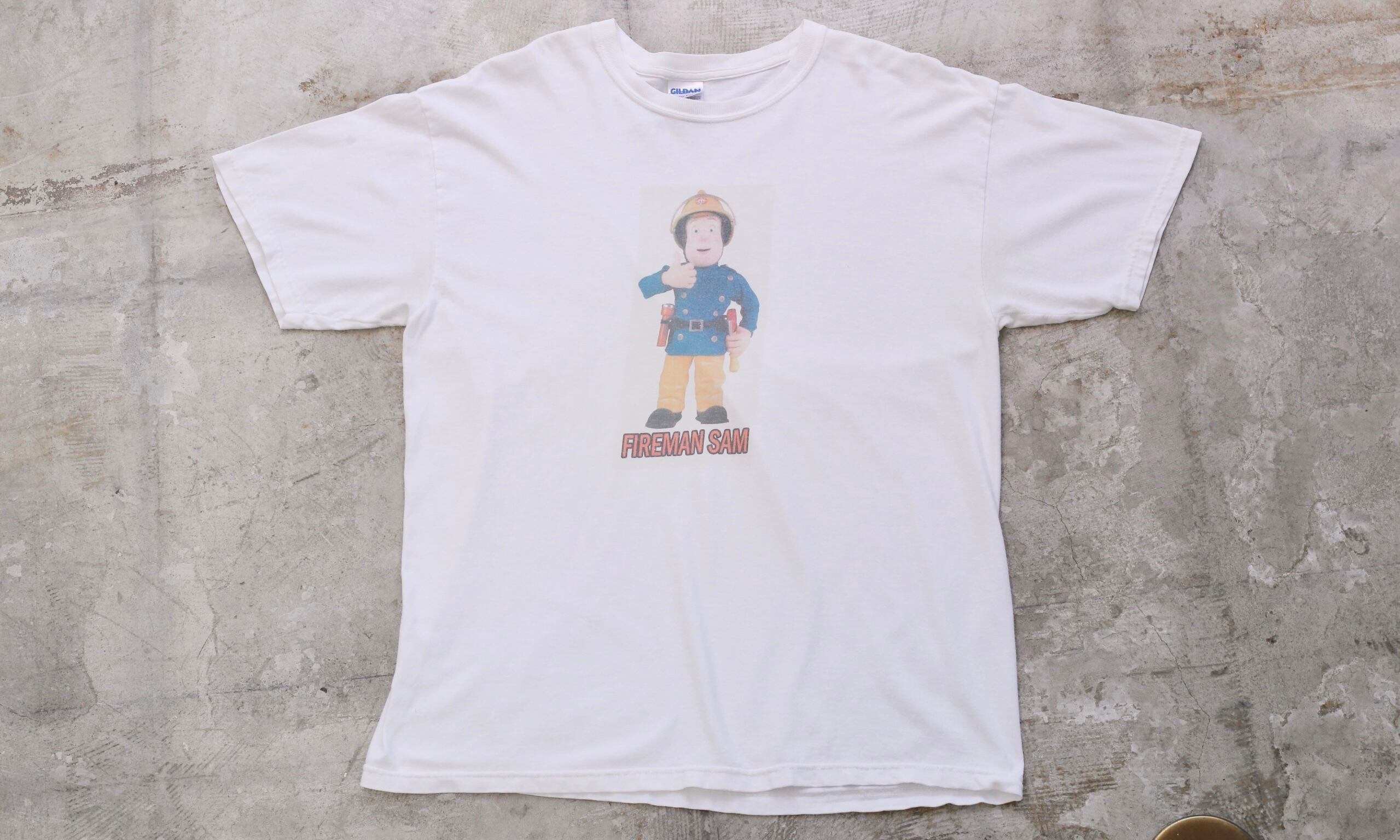 イギリスのアニメ「FIREMAN SAM」のキャラクターがプリントされたTシャツ。