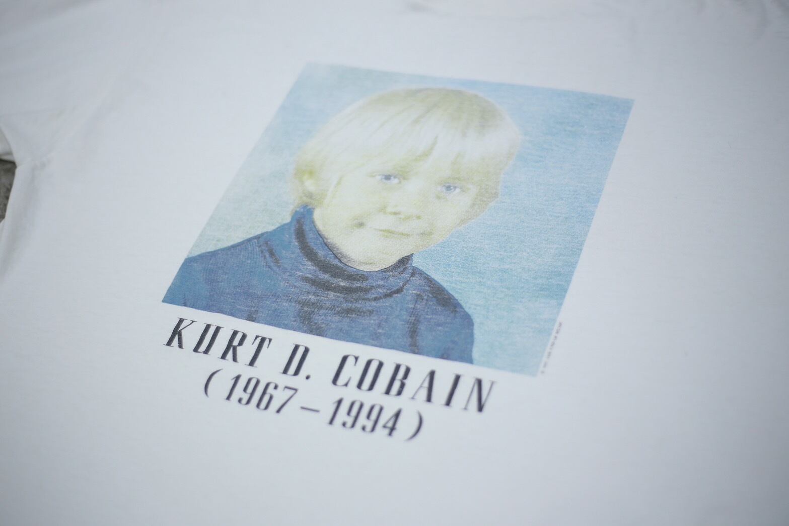 90年代USロックを代表する伝説のロックバンド「ニルバーナ」のフロントマン「カートコバーン」の幼少期の写真がプリントされた追悼Tシャツ。