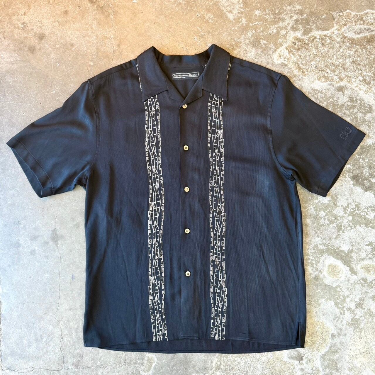 ブラックの刺繍デザインキューバシャツ。ベージュの刺繍が施され、ボタンの質感も特徴的で洒落たデザイン。レーヨンとポリエステルが使用され、光沢感がある生地感の逸品になっております。
